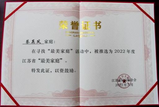 近日,江苏省妇联表彰了2022年度江苏省“最美家庭”,beat365蔡英凤家庭光荣上榜。