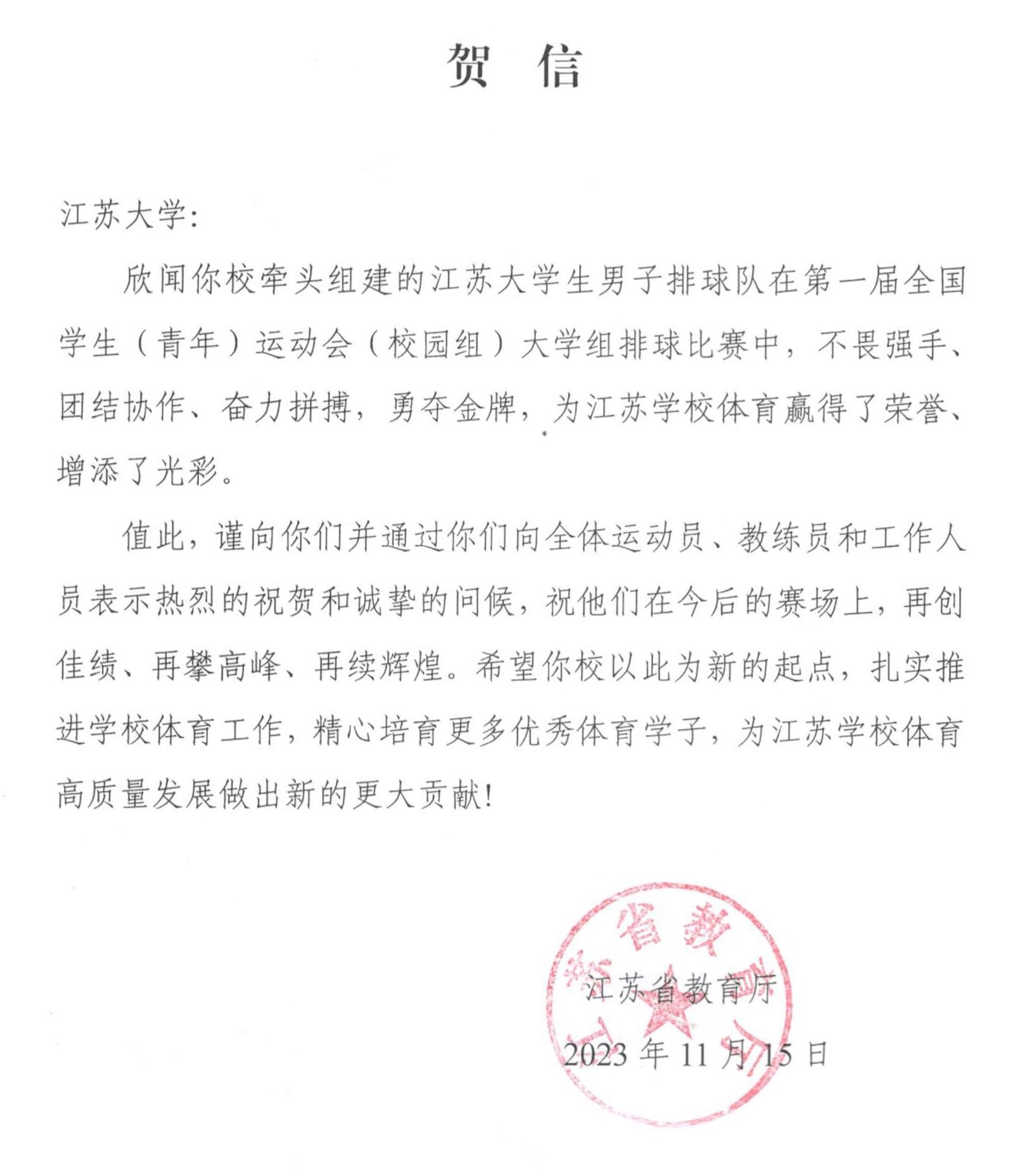 江苏省教育厅向beat365发来贺信,对beat365在本次比赛中取得的成绩表示祝贺,对学校体育工作给予了充分肯定,并希望学校以此为新起点,扎实推进学校体育工作,精心培育更多优秀体育学子,为江苏学校体育高质量发展作出新的更大贡献。