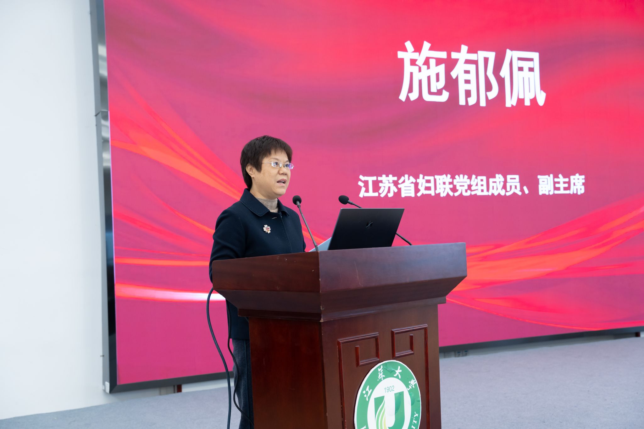 施郁佩传达了学习习近平总书记在中央经济工作会议的重要讲话精神,表示要深入学习贯彻习近平总书记同全国妇联新一届领导班子成员集体谈话时的重要讲话精神,落实好中国妇女十三大和江苏省妇女十四大部署,积极践行习近平总书记赋予江苏“在科技自立自强上走在前”“在科技创新上取得新突破”的重大任务要求,实施“五个一百”计划,持续深化科技创新巾帼行动,激发女性创业创新活力,积极投身中国式现代化江苏新实践。