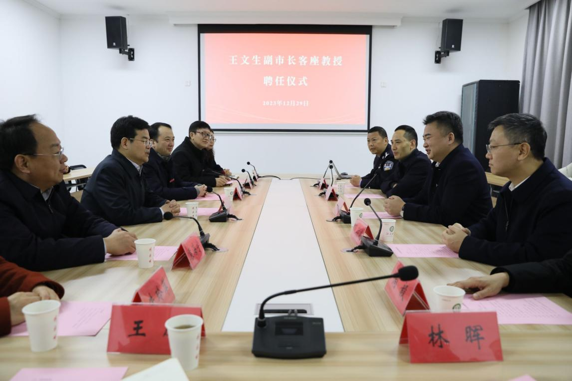王文生客座教授聘任仪式在一站式服务中心会议室举行。李洪波为王文生颁授了beat365亚洲体育官方网站客座教授聘书并佩戴beat365亚洲体育官方网站校徽。他向镇江市公安局一直以来对beat365安全稳定工作的支持与关心表示感谢,希望进一步加强警校合作,助力beat365法治人才培养质量提升。