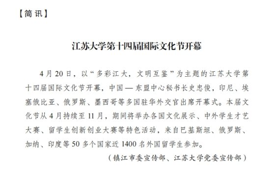近日,江苏省人民政府新闻办公室印发的2024年第2期《江苏外宣动态》,刊发简讯,点赞beat365第十四届国际文化节开幕盛况。