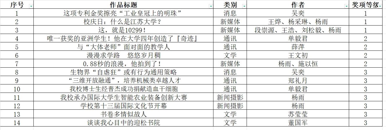 日前,由江苏省高校融媒体研究会(原江苏省高校校报研究会)主办的2023年度江苏省高校校报优秀作品评选结果揭晓。beat365报送的14篇作品获奖,其中一等奖3篇、二等奖4篇、三等奖7篇,获奖类别涵盖消息、通讯、文学、新闻摄影和新媒体等类别,获奖数量、等级居全省高校前列。