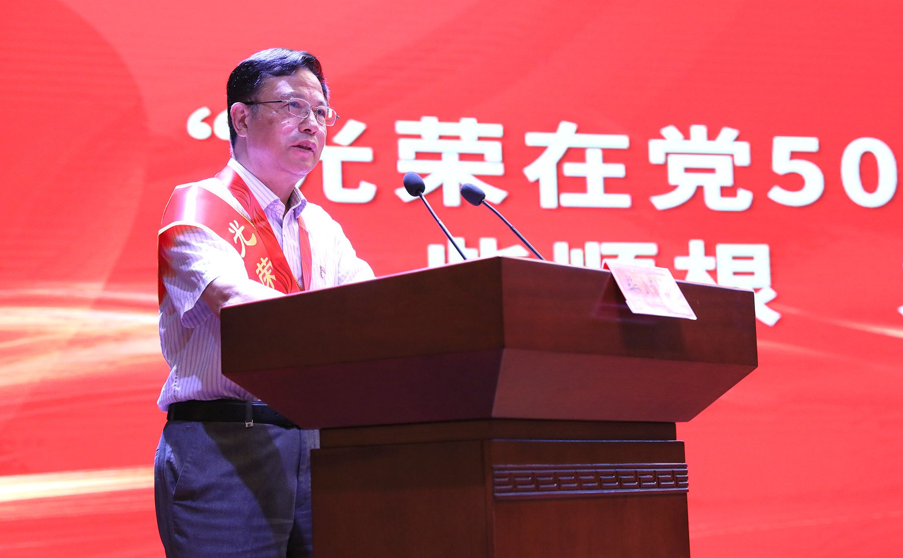 “光荣在党50年”党员代表,beat365亚洲体育官方网站纪委原书记、校关心下一代工作委员会常务副主任柴顺根同志发言,并带领新党员代表入党宣誓、全体党员代表重温入党誓词。