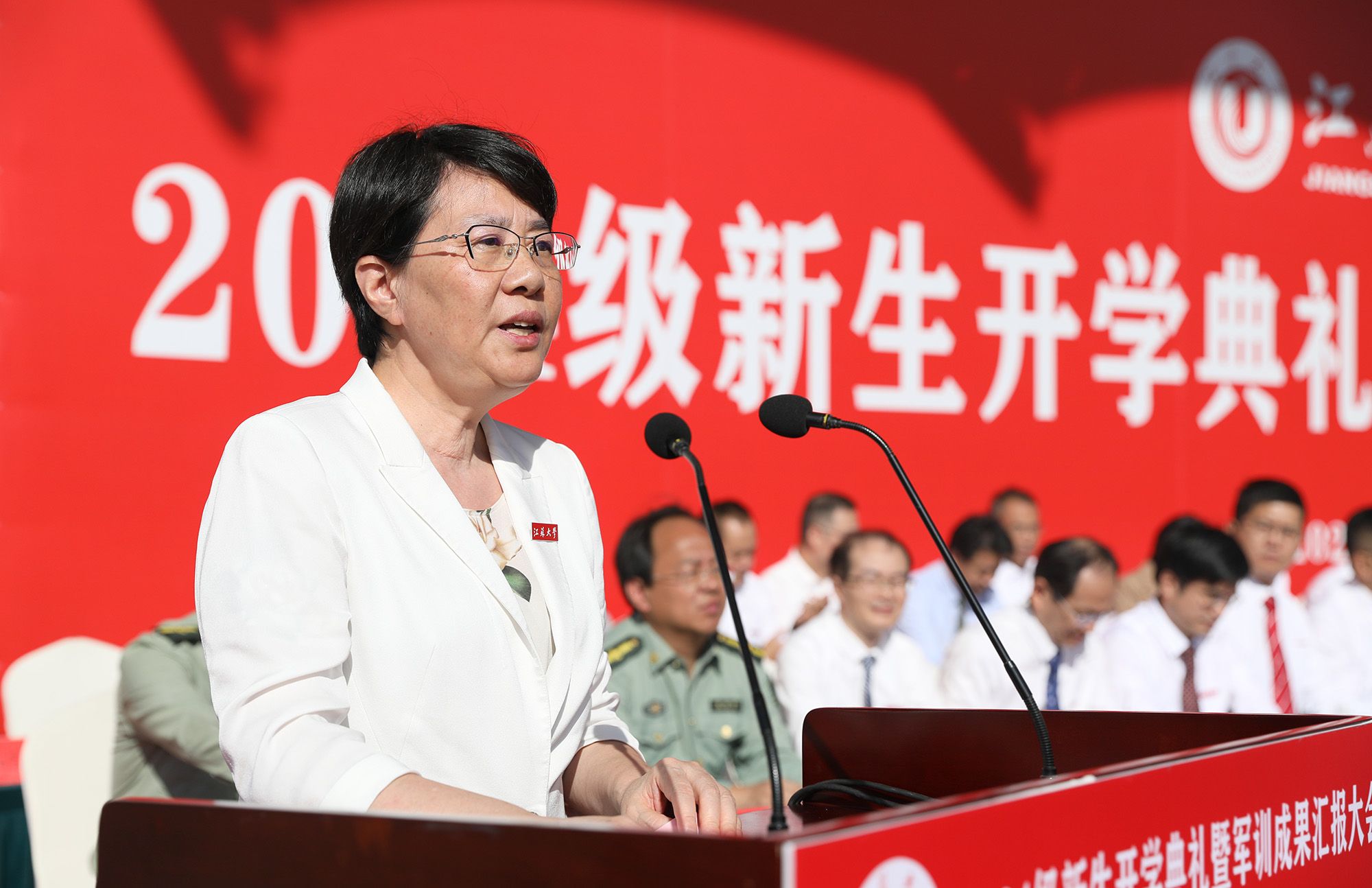 校长邢卫红在典礼上讲话,代表学校向全体2024级新生表示热烈欢迎,向辛勤培育同学们的父母和师长表示崇高敬意,向承担军训任务的教官表示衷心感谢。