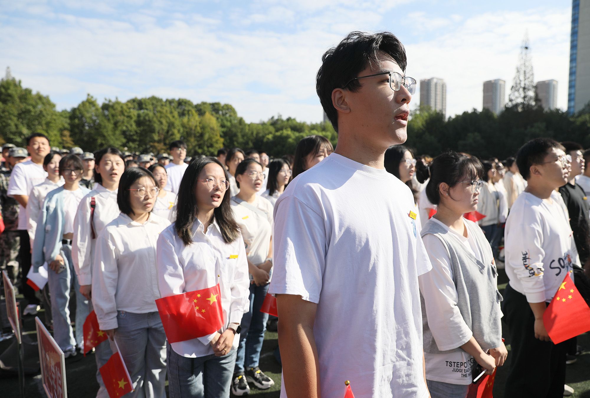 在中华人民共和国75周年华诞来临之际,典礼上,师生挥舞手中的旗帜,唱响《我和我的祖国》,歌颂美好新时代,祝福伟大祖国更加繁荣昌盛、灿烂辉煌。