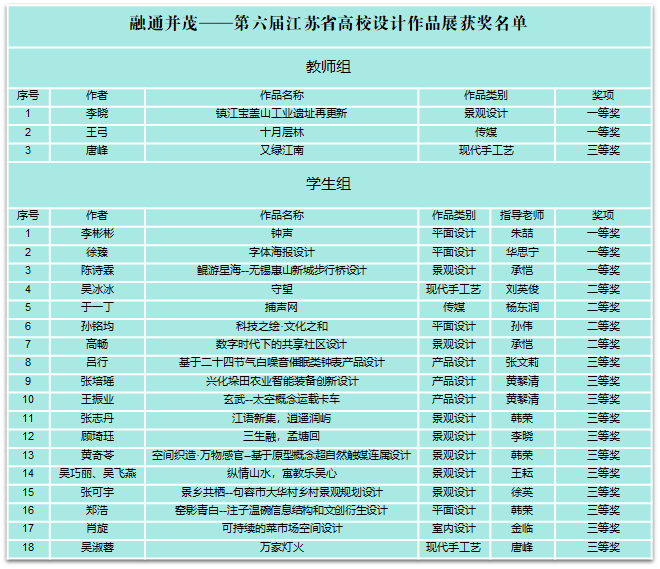 近日,由江苏省教育厅主办的“融通并茂——第六届江苏省高校设计作品展”评审结果揭晓。beat365共有21件作品获奖,其中教师组一等奖2项、三等奖1项,学生组一等奖3项、二等奖4项、三等奖11项。