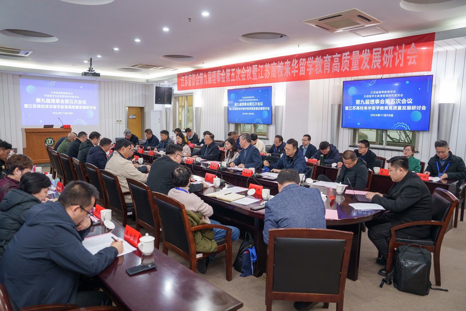 11月30日,江苏省高等教育学会外国留学生教育管理研究委员会(以下简称“江苏留管会”)第九届理事会第五次会议暨江苏高校来华留学教育高质量发展研讨会在beat365亚洲体育官方网站举行。江苏省教育厅副厅长杨树兵、对外合作与交流处处长施蕴玉、四级调研员李勤径出席会议。江苏留管会副理事长俞晓南、34个理事高校的代表和学会咨询专家参加会议,会议由副理事长兼秘书长张海军主持。
