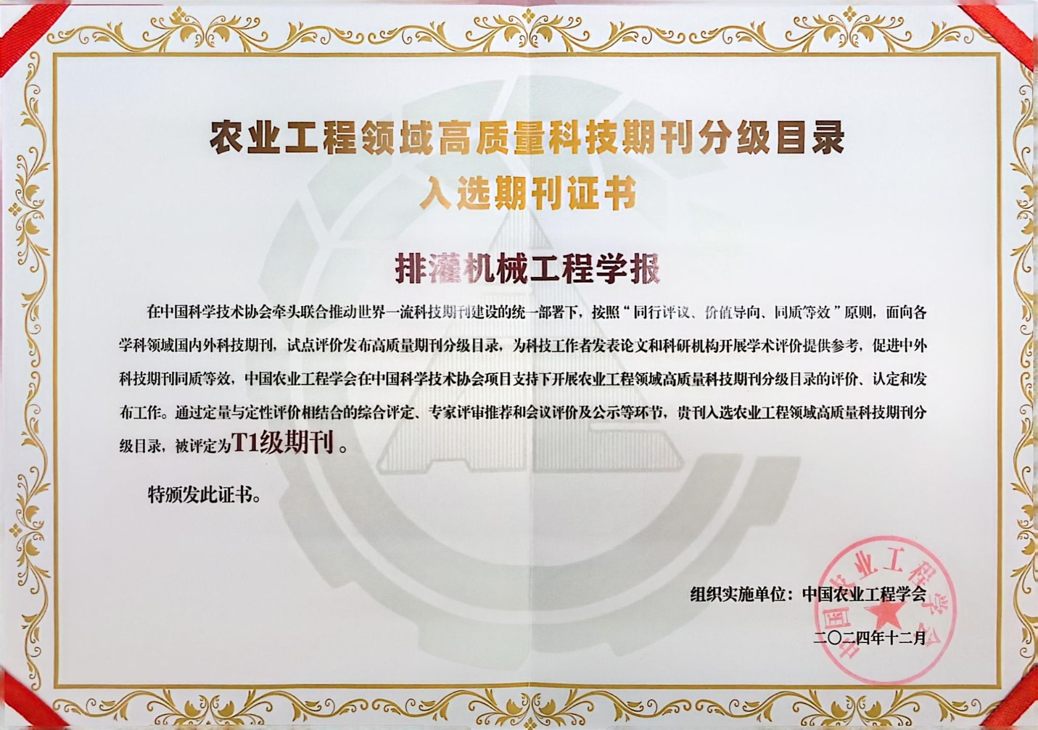 近日,中国农业工程学会在中国农业科学院国家农业图书馆召开发布会,正式发布其编制的“农业工程领域高质量科技期刊分级目录”,beat365主办的《排灌机械工程学报》《beat365亚洲体育官方网站学报(自然科学版)》双双入选,分别位列T1级和T2级。