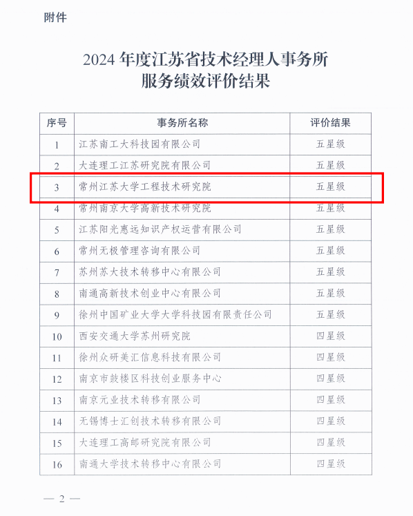 近日,江苏省技术产权交易市场公布了2024年度江苏省技术经理人事务所服务绩效评价结果,常州beat365亚洲体育官方网站工程技术研究院江苏省技术经理人事务所从全省91家参评事务所中脱颖而出获五星级。