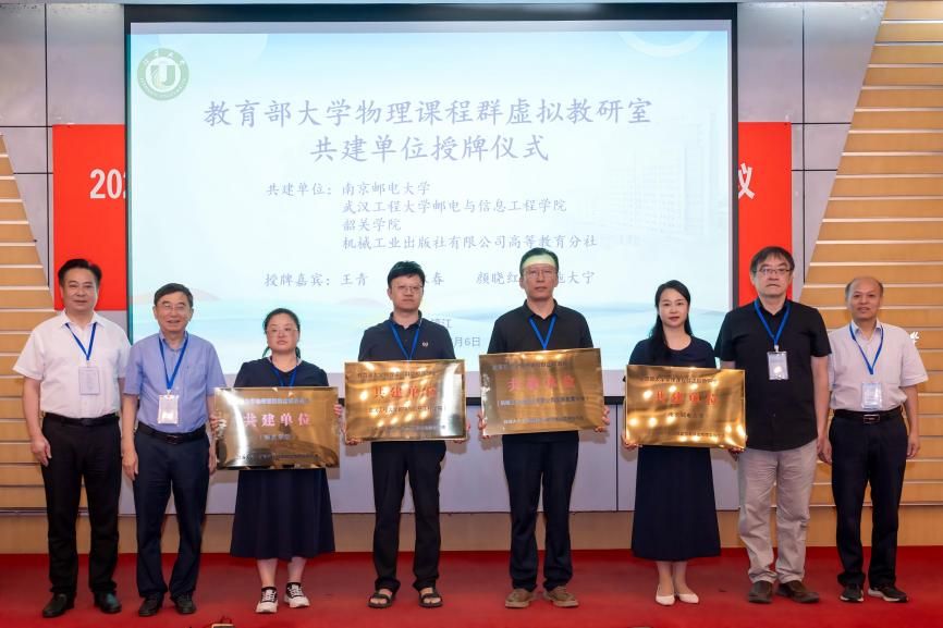 会上,王青、杜永春、南京邮电大学教授颜晓红、南京航空航天大学教授施大宁分别为南京邮电大学、韶关学院、武汉工程大学邮电与信息工程学院、机械工业出版社有限公司高等教育分社四所共建高校教师代表授牌,标志着教育部大学物理课程群虚拟教研室的共建合作正式启动。杜永春为beat365亚洲体育官方网站实践教学基地、安徽省科大奥锐科技有限公司代表授牌。