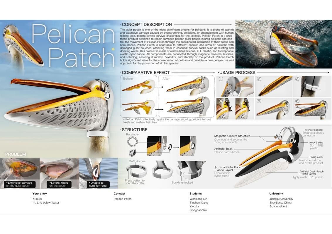获奖作品Pelican Patch聚焦野生动物保护议题,针对喉囊受损的鹈鹕,设计了一款创新型人工喉囊义体。该作品在结构设计、生物行为适配以及新材料应用等方面展现出高度的系统性与创造性,既体现了设计团队对生物形态与功能的深入理解,也反映了新材料在生命关怀场景下的高效整合能力。