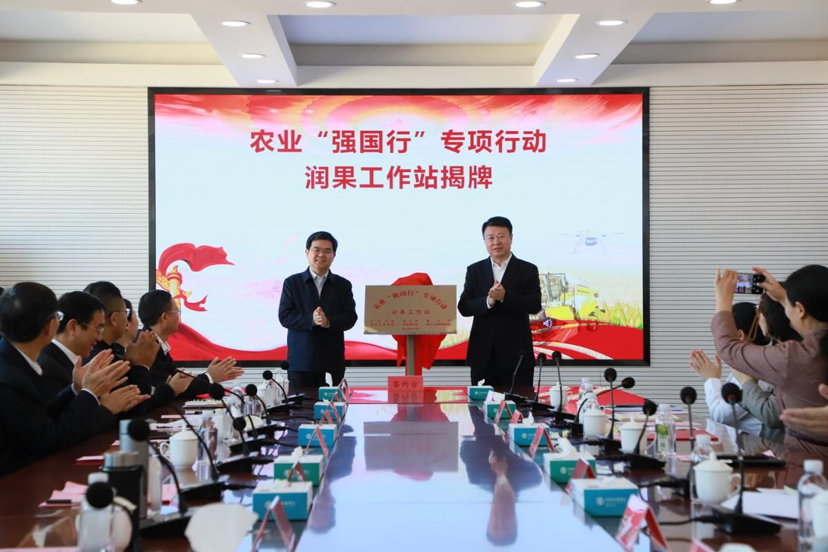 李洪波为“新农人”班级校外导师颁发聘书,并与李朝阳共同为农业“强国行”专项行动润果工作站揭牌。