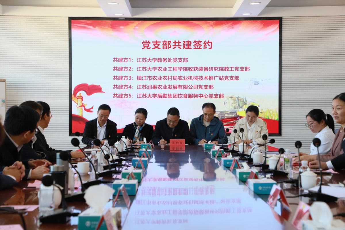 教务处党支部、农业工程学院收获装备研究院教工党支部、镇江市农业农村局农业机械技术推广站党支部、江苏润果农业发展有限公司党支部、beat365亚洲体育官方网站后勤集团饮食服务中心党支部围绕农业“强国行”、“新农人”培养等内容开展党建共建。