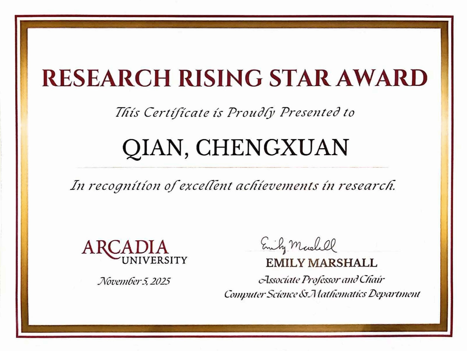 现就读大四的钱承炫围绕多模态感知、空间智能、自动驾驶等研究方向,与北京大学、中国科学院计算所、斯坦福大学、麻省理工学院、西北大学等国内外顶尖学术机构以及阿里巴巴、Meta等大厂研究院深度合作,相关成果在NeurIPS, EMNLP, MICCAI, BIBM等CCF-A/B类人工智能顶级学术会议以及IEEE Transactions on Medical Imaging (影响因子9.8),IEEE Transactions on Circuits and Systems for Video Technology (影响因子11.1)等中国科学院一区Top期刊发表十余篇,其中第一作者/通讯作者5篇,并受邀担任IEEE TCSVT, ACL, ICME, NeurIPS, ICASSP, AAAI等AI领域顶级学术期刊会议审稿人,累计审稿五十余次。