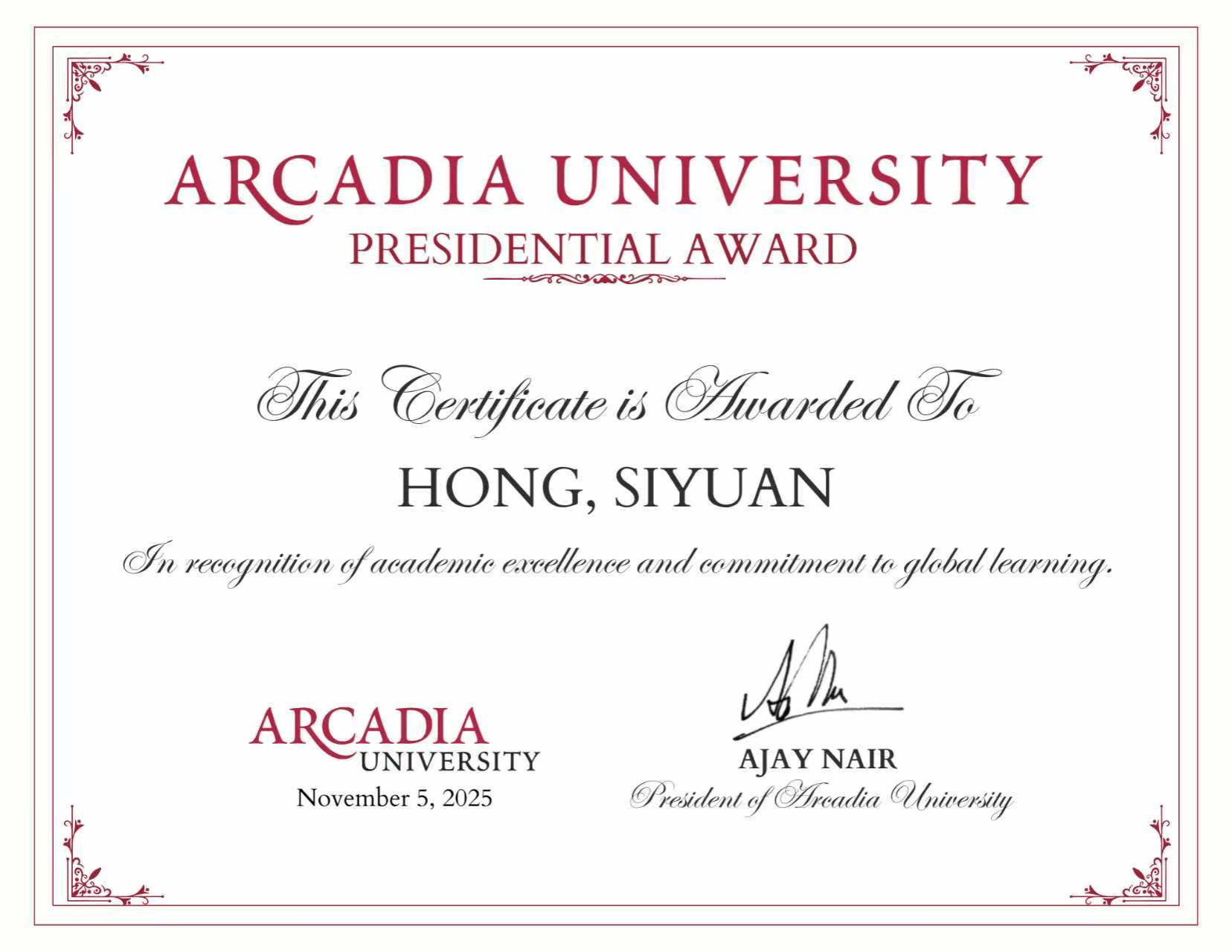 现就读大三的洪思源主修数学、辅修心理学与计算机科学,专业成绩顶尖。她不仅学术能力突出,更积极投身校园建设,在阿卡迪亚大学校友返校家庭周末活动中,作为唯一带领美国家庭参与活动的国际生赢得多方赞誉。在beat365学习期间,洪思源曾获本科生国家奖学金、beat365亚洲体育官方网站学业奖学金特等奖、2025年美赛数学建模竞赛荣誉奖,并在《物理学前沿》期刊发表论文。