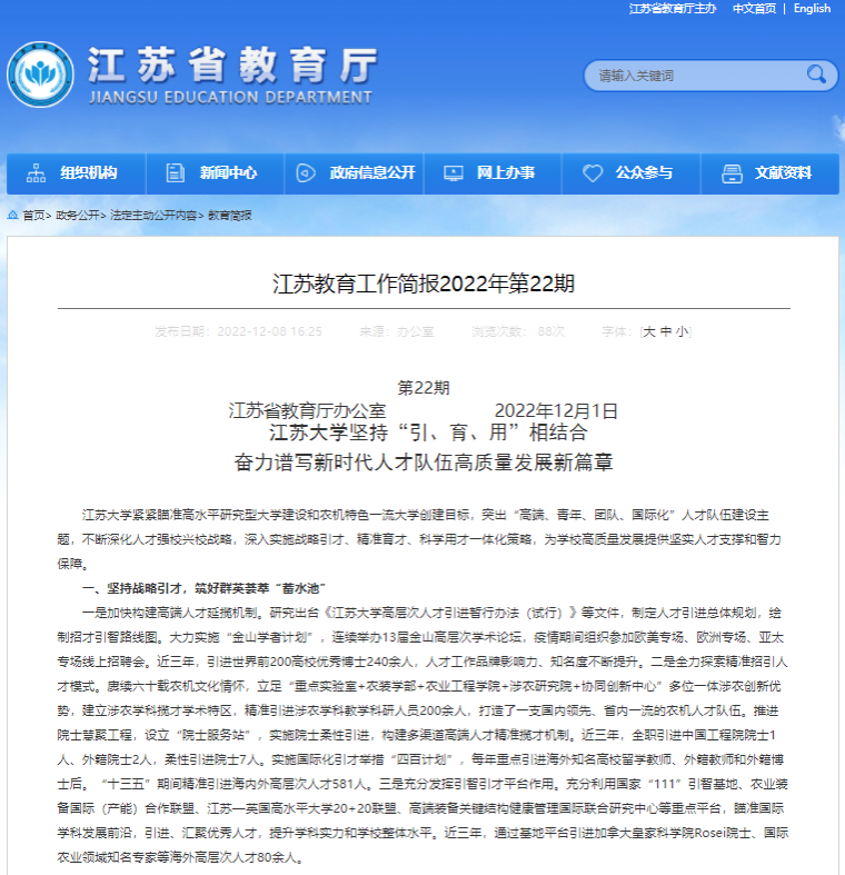 12月8日,江苏省教育厅《江苏教育工作简报》(2022年第22期)以《beat365亚洲体育官方网站坚持“引、育、用”相结合 奋力谱写新时代人才队伍高质量发展新篇章》为题,从坚持战略引才,筑好群英荟萃“蓄水池”;坚持精准育才,厚植全面成长“好沃土”;坚持科学用才,彰显才尽其用“大作为”三个方面,专题报道了beat365人才工作的思路、举措与成效。
