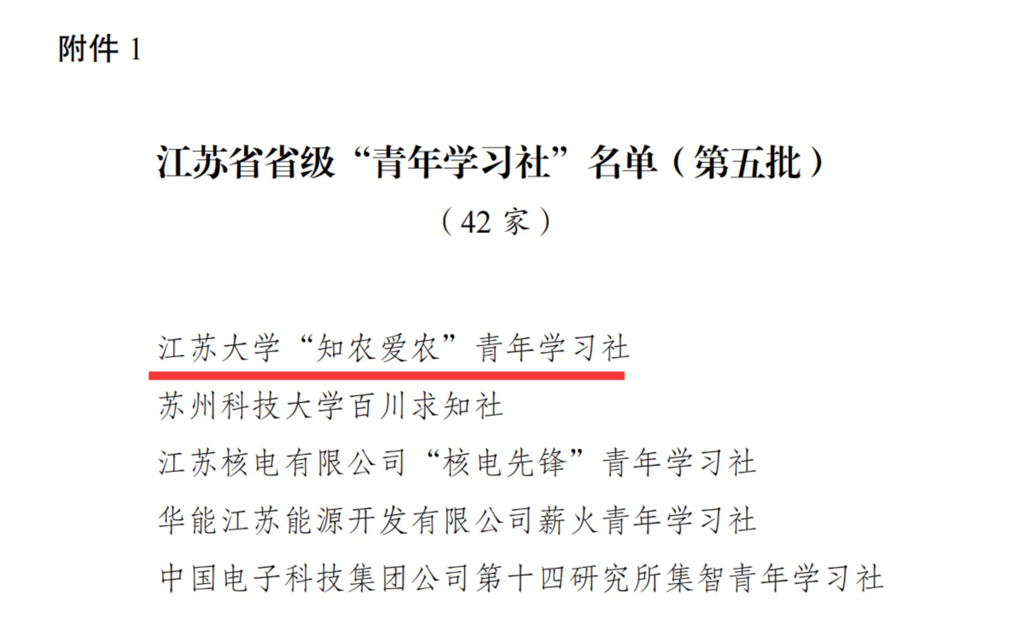 近日,共青团江苏省委发布《关于命名江苏省省级“青年学习社”及线路的决定》,全省共42家“青年学习社”被命名为第五批省级“青年学习社”,beat365“知农爱农”青年学习社入选。