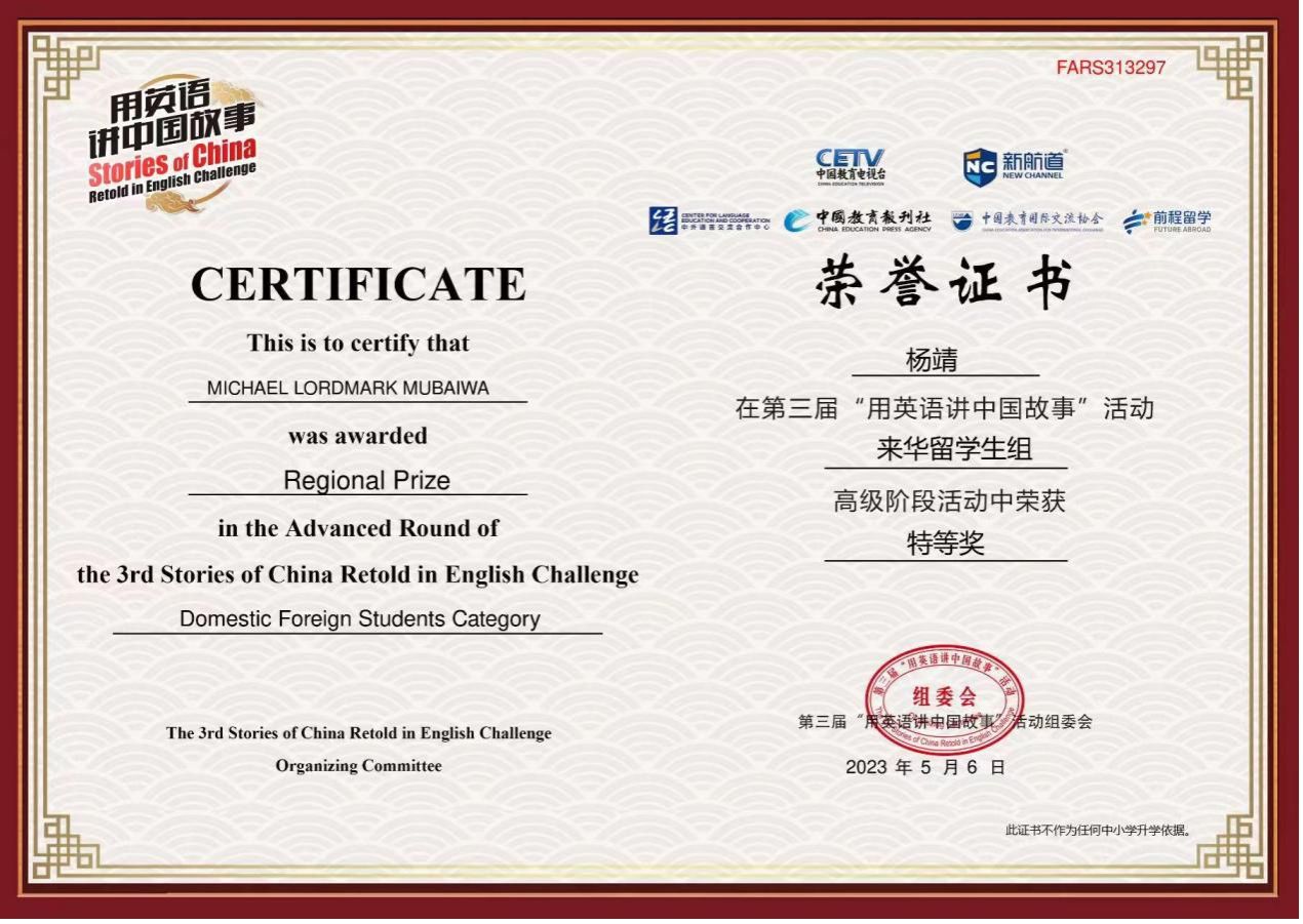 近日,beat365津巴布韦籍留学生杨靖在第三届“用英语讲中国故事”活动中获全国总决赛特等奖。