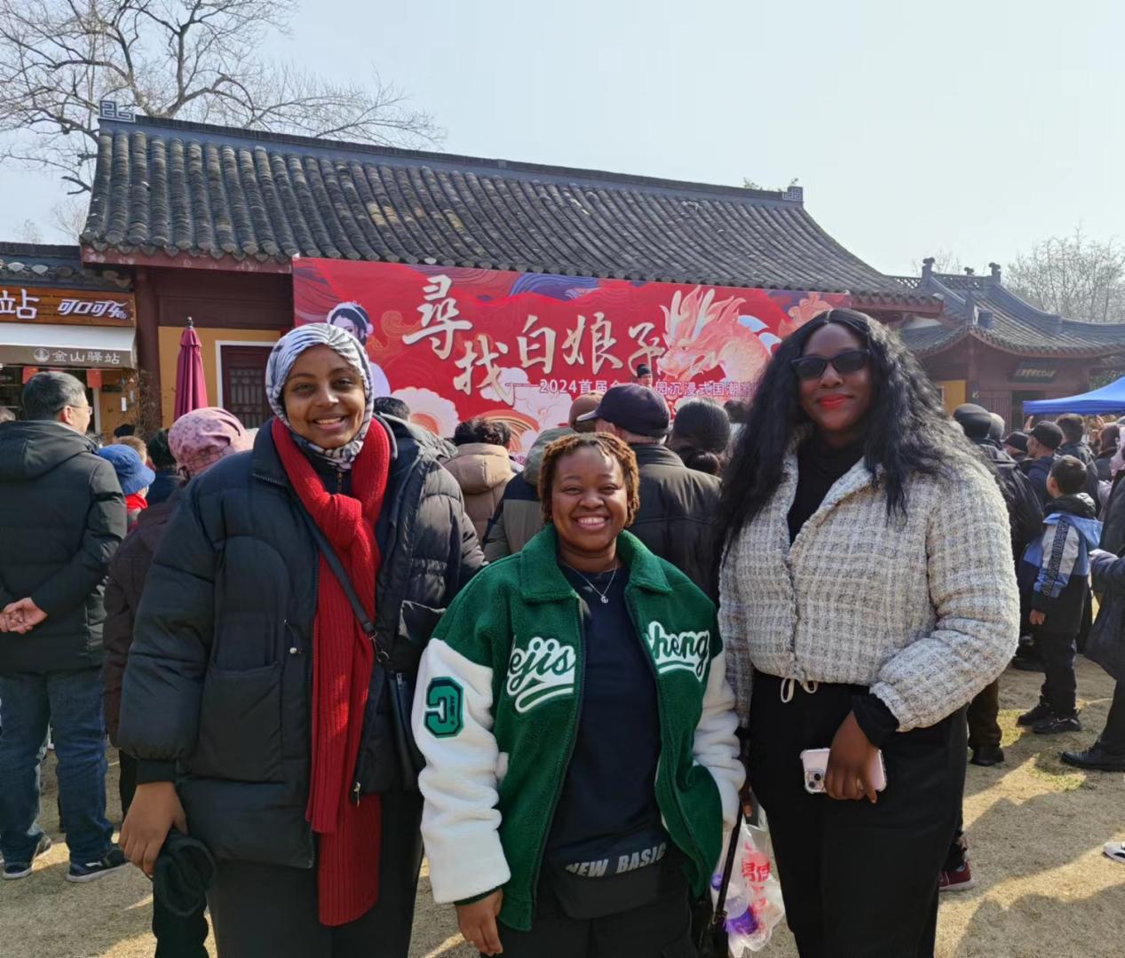 今年是来自坦桑尼亚的法提娅在中国度过的第五个春节,在beat365亚洲体育官方网站就读临床医学专业的她还有一年就将完成自己的学业,约上三两好友,在春节期间感受镇江浓浓的年味,对于法提娅来说这还是第一次。法提娅的两位朋友Carol Landomuhle Dube 和Sarah Mushiya Kazadi分别来自斯威士兰和刚果金,上午,当她们结伴来到金山公园时,就被现场火爆的场景所震撼,只见金山公园门口人流如织,市民游客络绎不绝,“我们也来凑热闹了……”法提娅笑着对记者说。