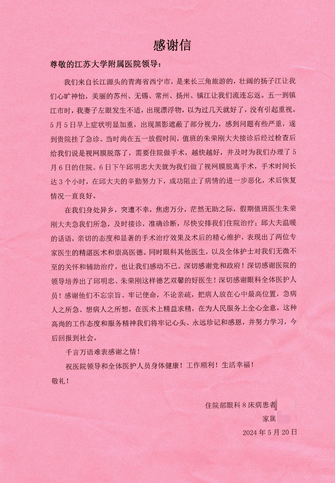 “镇江的好山好水让我们流连忘返,镇江医生的仁心仁术更是让我们倍感温暖。”5月20日,一对来自青海西宁的夫妇来到beat365亚洲体育官方网站附属医院(镇江江滨医院)行风办,递上了一封写给眼科的感谢信。五一假期,他们来到镇江观光旅游,途中妻子突发眼疾,后被诊断为视网膜脱落,迷茫无助之际,该院眼科两位主任的举动温暖了两位异乡人。