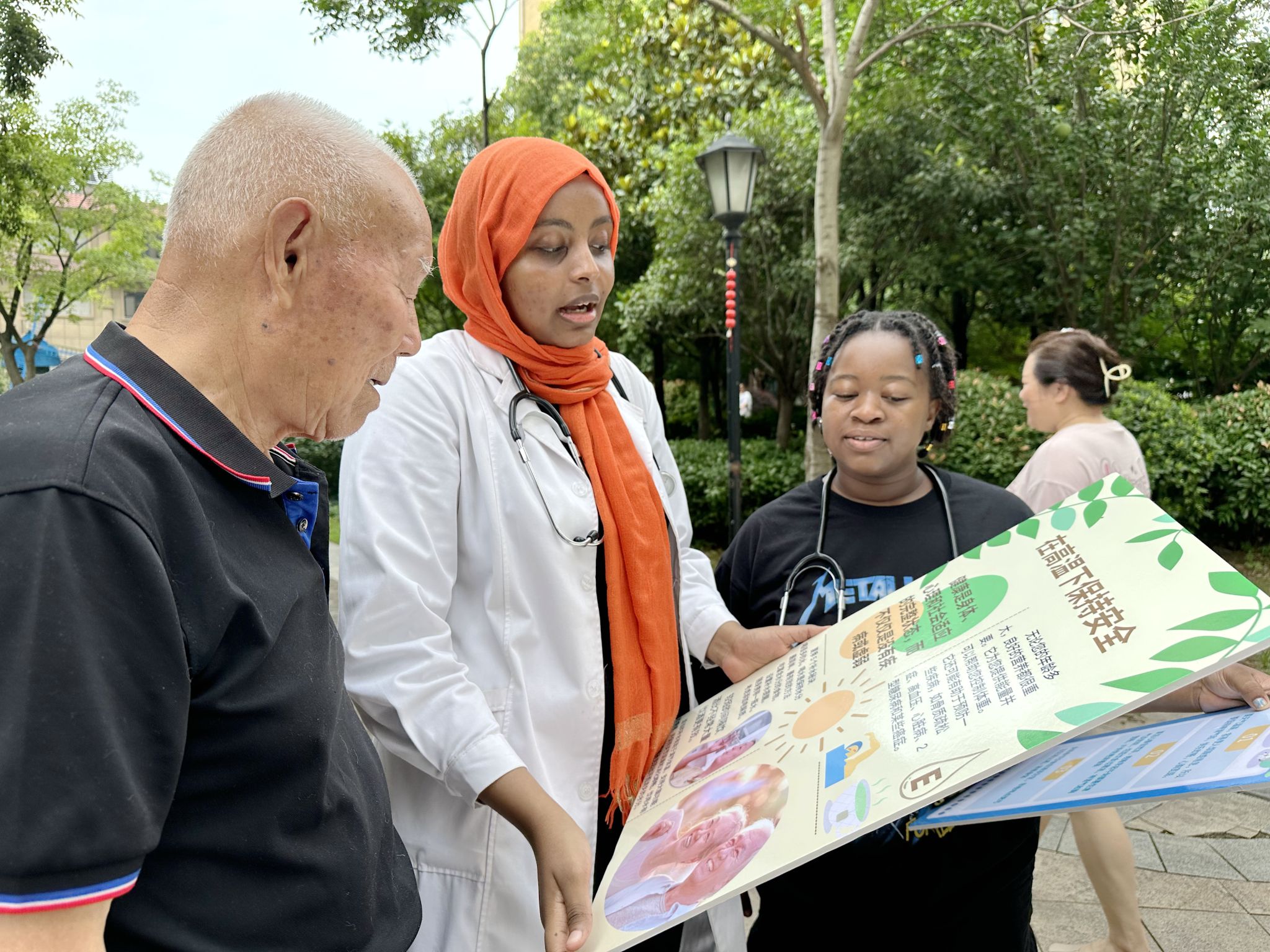 在社区义诊活动中,法缇娅·赛义德(左二)向居民介绍夏季高温应对常识。