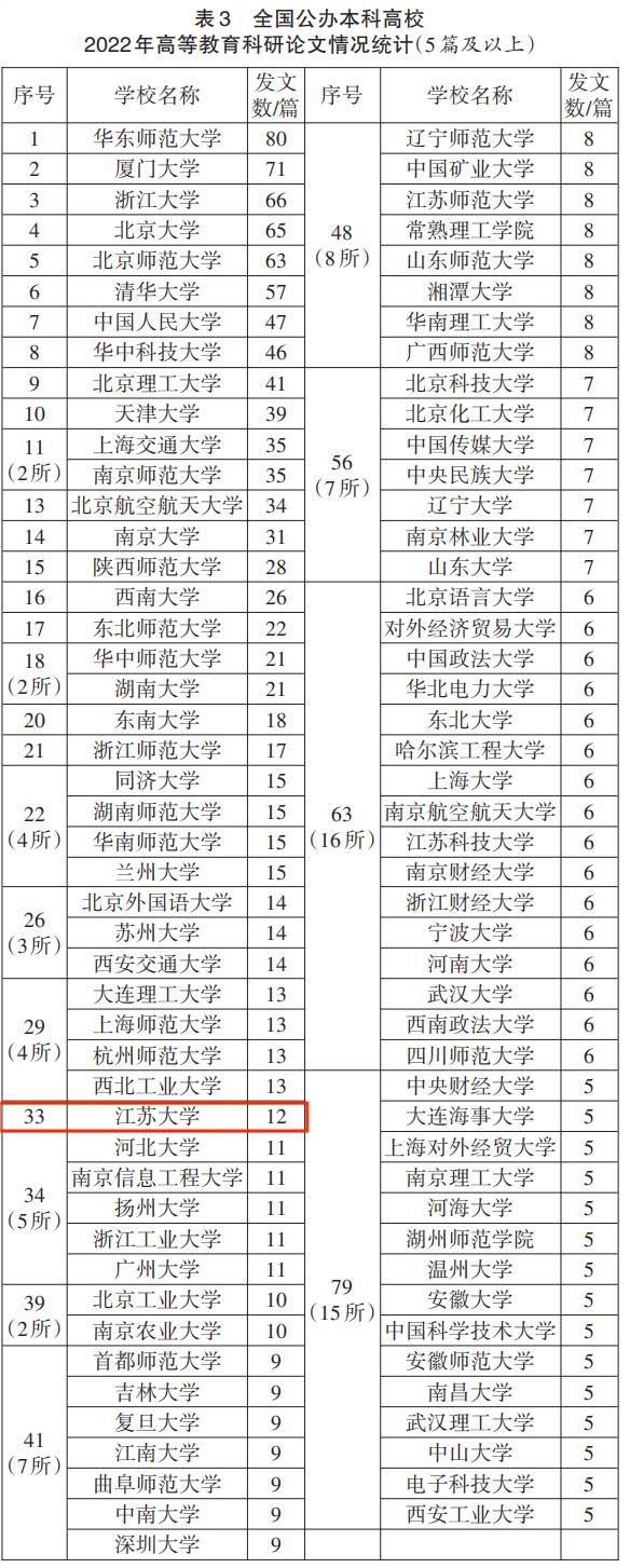近日,《中国高教研究》发布了《2022年全国高校高等教育科研论文分析——基于19家教育类最具影响力期刊的发文统计》。在全国公办本科高校高等教育科研论文情况统计中,beat365以12篇发文进入排行榜,位列全国第33位,比上年度进步5名。