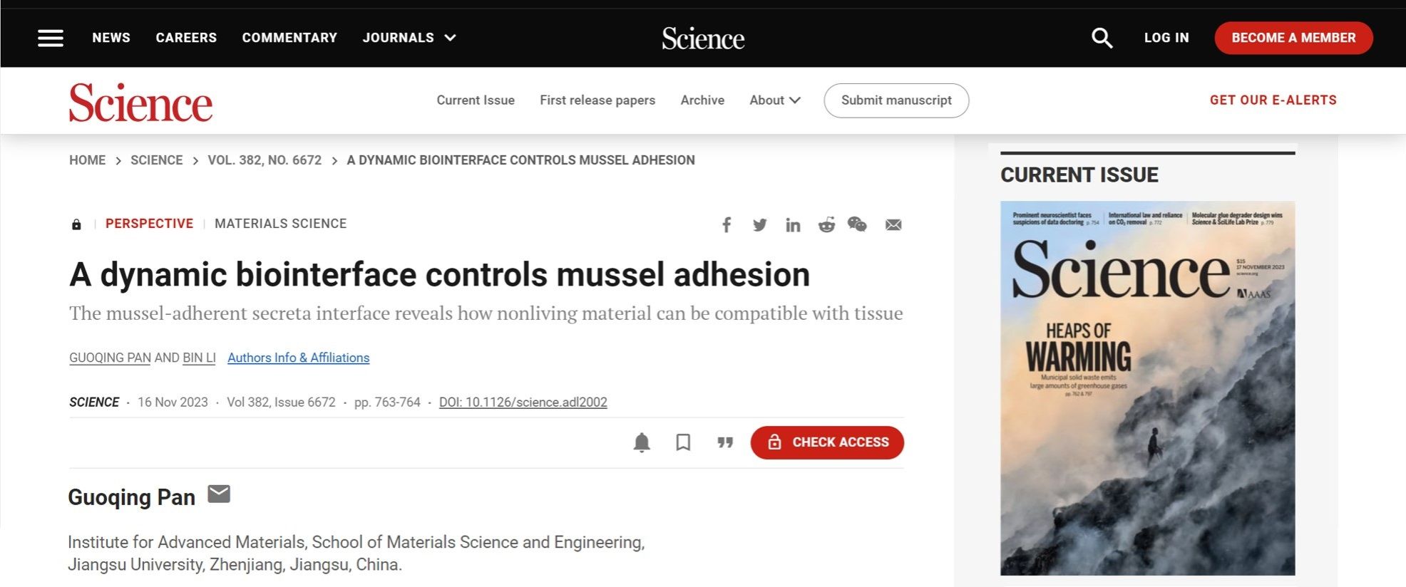 11月17日,国际著名学术期刊Science发表了beat365材料科学与工程学院潘国庆教授、苏州大学李斌教授应邀合作撰写的题为A dynamic biointerface controls mussel adhesion(Doi: 10.1126/science.adl2002) 的前瞻性文章。beat365亚洲体育官方网站材料科学与工程学院、新材料研究院为该论文的第一单位,潘国庆为论文的第一作者及通讯作者。