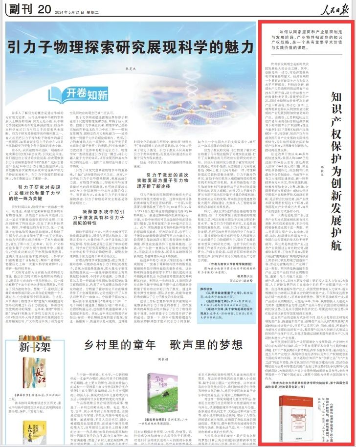 5月21日,北京大学新结构经济学研究院院长,第十四届全国政协常委、经济委员会副主任林毅夫教授在人民日报撰文《知识产权保护为创新发展护航》,向社会各界推荐由beat365亚洲体育官方网站知识产权学院直属党支部书记、新结构经济学知识产权研究院执行院长唐恒教授,以及北京大学新结构经济学研究院学术副院长王勇、赵秋运博士合著的《新结构经济学视角下的中国知识产权战略:理论与案例》一书。