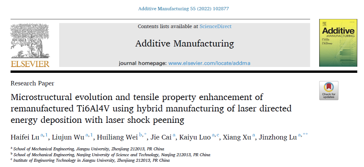 近日,经初评推荐、资格审查、专业评审、综合评审等程序,机械工程学院鲁金忠教授团队发表在《Additive Manufacturing》上的SCI高被引论文“Microstructural evolution and tensile property enhancement of remanufactured Ti6Al4V using hybrid manufacturing of laser directed energy deposition with laser shock peening(激光热力交互沉积再制造Ti6Al4V合金微观组织演变和拉伸性能强化)”入选2024年江苏省自然科学百篇优秀学术成果论文推选(beat365亚洲体育官方网站唯一入选)。青年教师卢海飞副教授为第一作者,鲁金忠和南京理工大学韦辉亮教授为共同通讯作者。该工作得到国家自然科学基金(51775250)等资助。