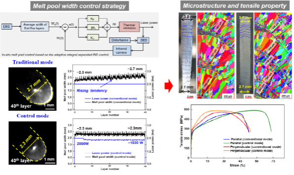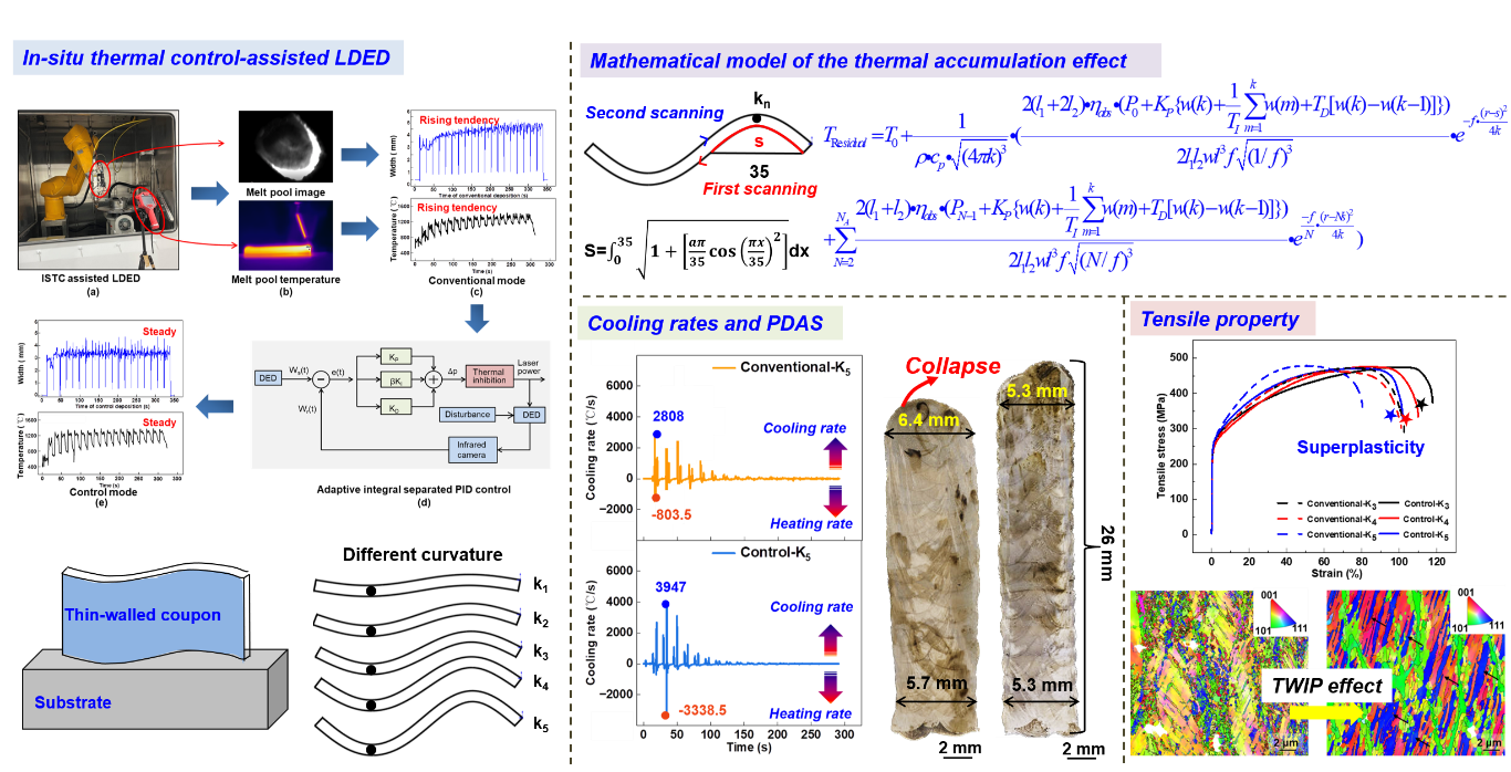 该研究成果提出了一种熔池原位控制辅助激光定向能量沉积工艺(ISTC-LDED),推导了以经典热传导理论为基础的平面和曲面薄壁件热效应模型,该技术阐明了层间柱状晶和等轴晶的连续演化机制并实现了构件厚度一致性。同时,ISTC-LDED技术诱导的316L不锈钢孪晶塑性变形效应可以显著提升强韧性。博士生苏尤宇为第一作者,罗开玉教授、鲁金忠教授为通讯作者。